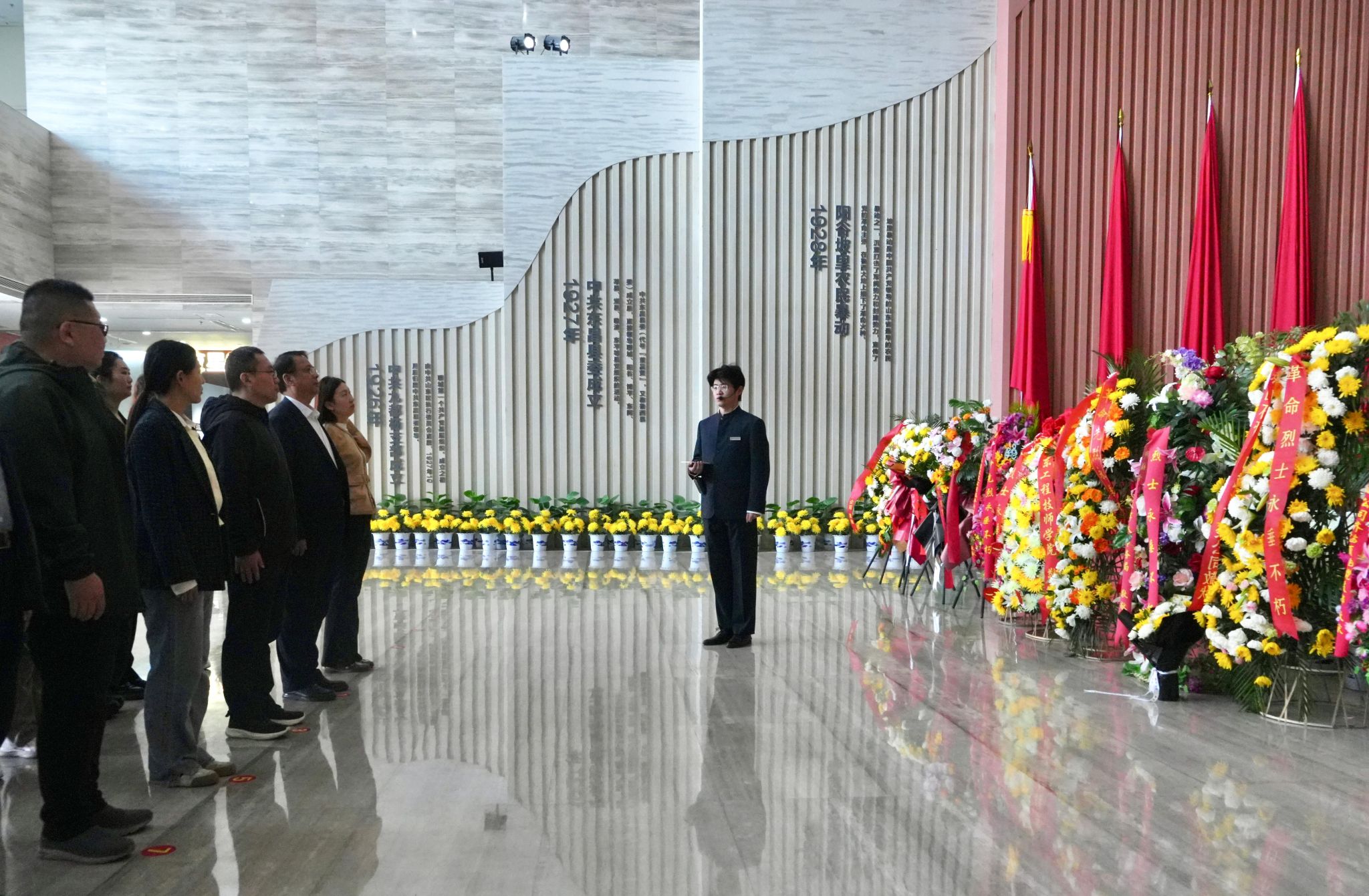 随后,一行人手捧鲜花前往烈士墓区。春日的陵园龙柏苍翠,黄色的菊花寄托哀思。大家神情肃穆,敬献鲜花,以庄重仪式缅怀英烈、致敬忠魂。