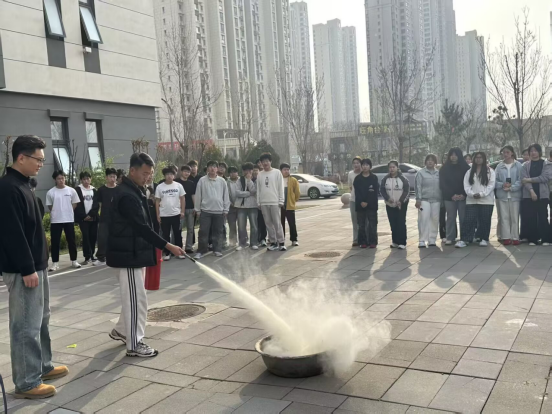 疏散演练结束后,辅导员逯尊鹏开展消防技能实操培训,讲解干粉灭火器、室内消火栓的适用场景与操作规范,重点演示灭火器“提、拔、握、压”操作步骤及初期火灾扑救要点。随后,师生轮流实操灭火,在实战中掌握消防技能。