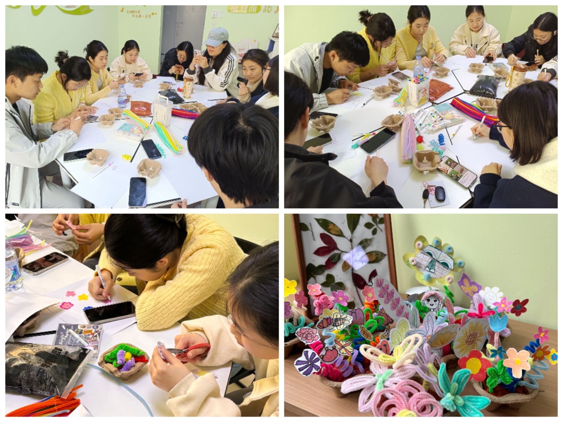 活动现场,同学们充分发挥创意巧思,用扭扭棒、彩绳、仿真花材、装饰珠等材料,亲手制作专属的春日摇摇花。大家或认真缠绕扭扭棒勾勒花型,或精心搭配色彩点缀细节,在指尖翻飞间,将春日的浪漫与生机融入每一朵小花。制作过程中,同学们围绕学业规划、情绪调节等话题畅所欲言,在动手实践的乐趣中深化了对生活美学的感知,还相互分享了春日养生、压力调节的实用小技巧,实现了创意碰撞与经验互通。