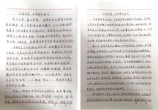 活动面向全院学生征集作品,设海报设计与主题征文两类。海报作品以视觉艺术传递国安理念,同学们用色彩线条勾勒政治安全、网络安全等领域内涵,展现维护国家安全的责任担当;征文作品以文字抒发爱国情怀,围绕国安与青年使命等主题,结合自身感悟诠释对国家安全的理解,彰显新时代青年的坚定决心。