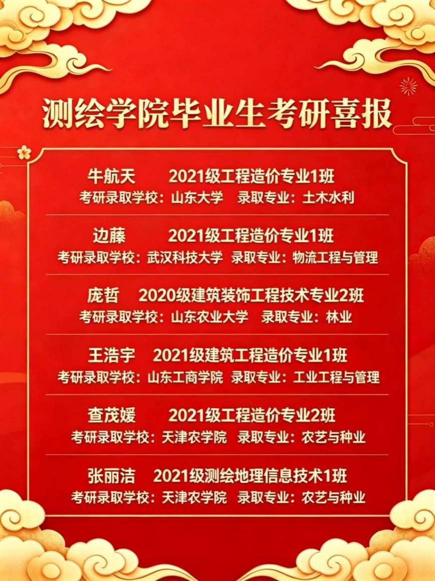 2021级工程造价专业1班牛航天,被山东大学录取;2021级工程造价专业1班边藤,被武汉科技大学录取;2021级建筑工程造价专业1班王浩宇,被山东工商学院录取;2021级工程造价专业2班查茂媛、2021级测绘地理信息技术1班张丽洁,均被天津农学院录取;2020级建筑装饰工程技术专业2班庞哲,被山东农业大学录取。